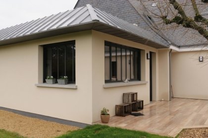 Son orientation lui permet de bénéficier d’un large éclairage naturel toute l’année. Mais surtout, pour laisser entrer un maximum de lumière, cet agrandissement a été équipé de verrières d’extérieur en acier : châssis fixes avec fenêtres intégrées et une porte. Des menuiseries toute en finesse réalisées avec notre profilé en acier MPH et privilégiant le clair de vitrage.